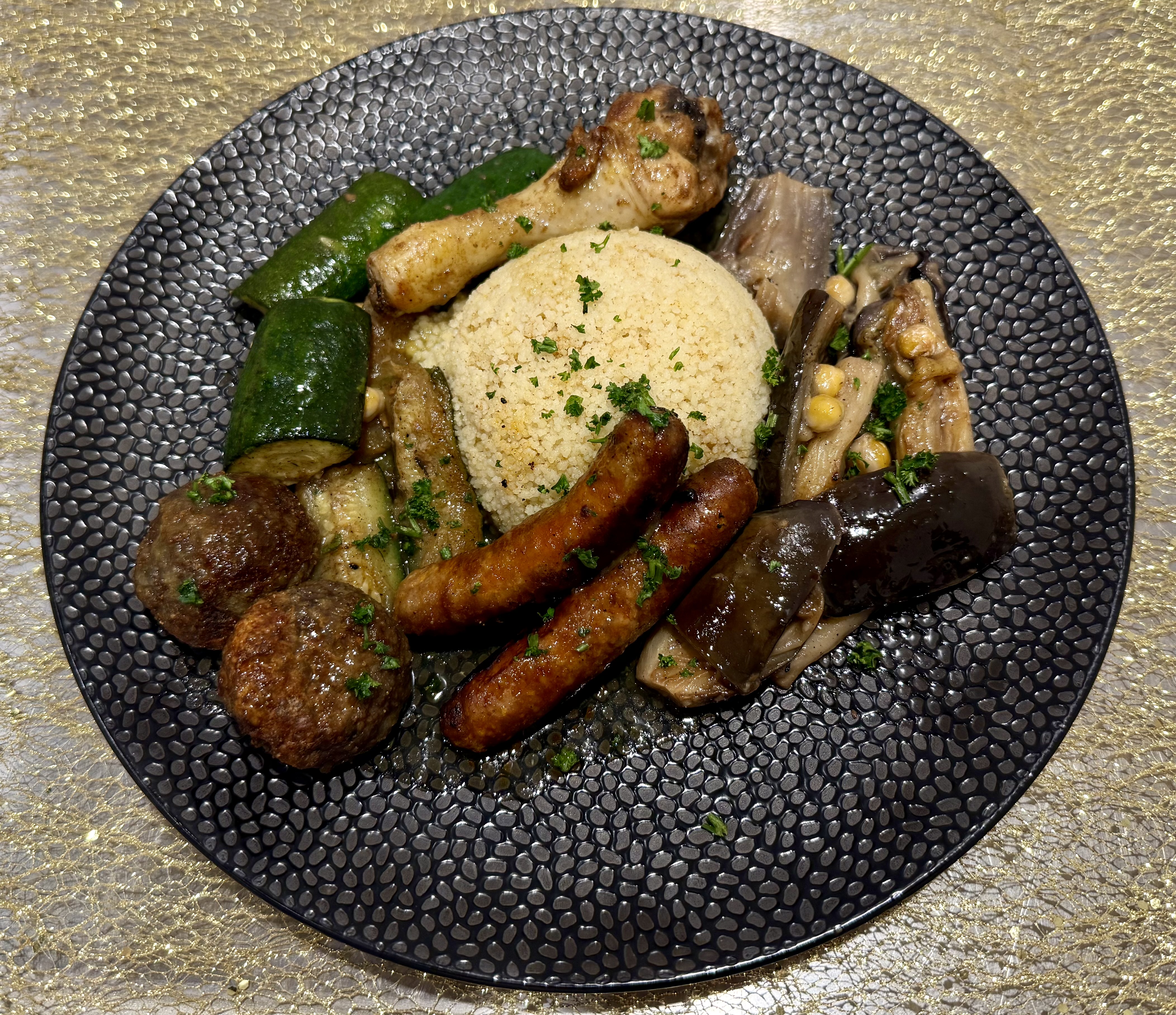 Couscous with merguez sausages, Chicken wings, Beef meatballs, Vegetables stricks and chickpeas